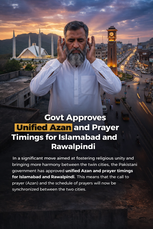 Govt Approves Unified Azan and Prayer Timings for Islamabad & Rawalpindi The federal government has officially approved a unified Azan and congregational prayer timetable for Islamabad and Rawalpindi to promo... Continue reading